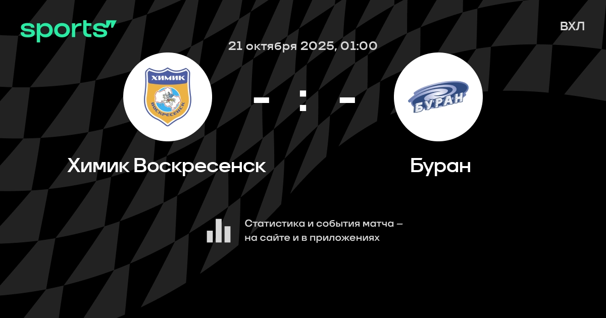 В предстоящем матче в рамках турнира ВХЛ пройдет встреча команд Химик Воскресенск - Буран в городе на стадионе Podmoskovie Ice Palace.