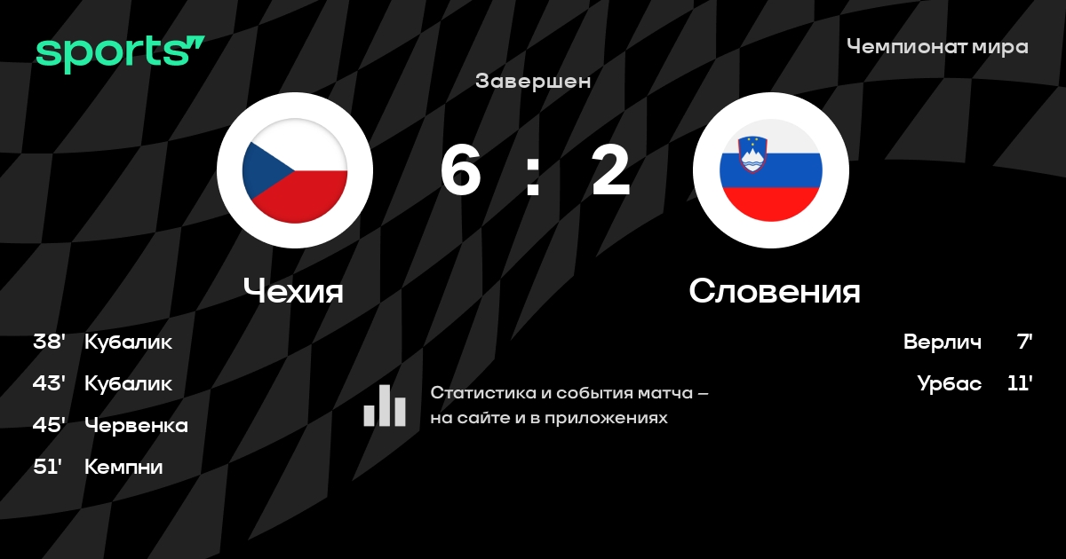 В прошедшем матче в рамках турнира Чемпионат мира Группа B состоялась встреча команд Чехия - Словения в городе Рига (Латвия) на стадионе Арена-Рига (вместимость - 12500)
