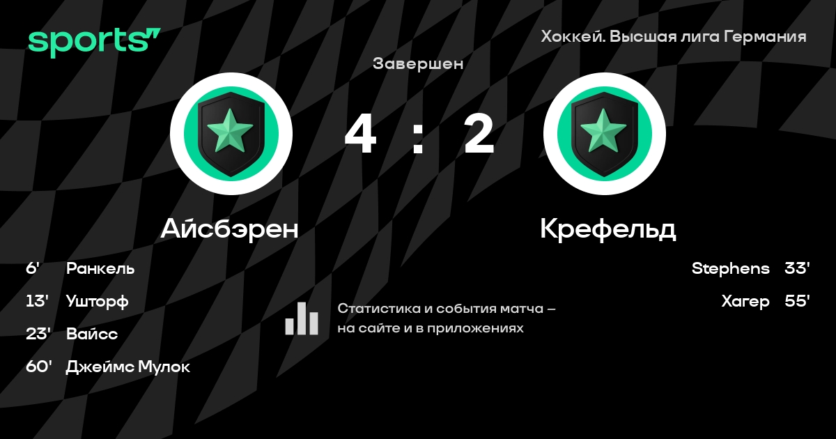 В прошедшем матче в рамках турнира Хоккей. Высшая лига Германия состоялась встреча команд Айсбэрен - Крефельд со счетом 4 : 2.