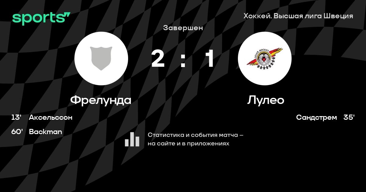 В прошедшем матче в рамках турнира Хоккей. Высшая лига Швеция состоялась встреча команд Фрелунда - Лулео со счетом 2 : 1.