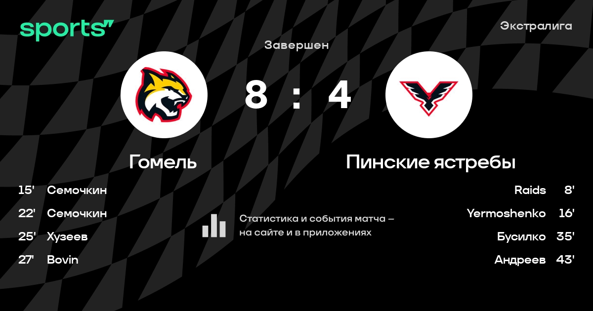 В прошедшем матче в рамках турнира Экстралига состоялась встреча команд Гомель - Пинские ястребы в городе Гомель (Беларусь) на стадионе Ледовый дворец Гомель (вместимость - 2700)
