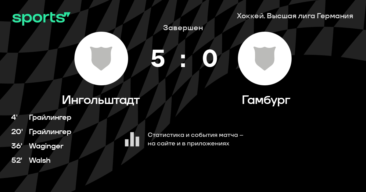 В прошедшем матче в рамках турнира Хоккей. Высшая лига Германия состоялась встреча команд Ингольштадт - Гамбург со счетом 5 : 0.