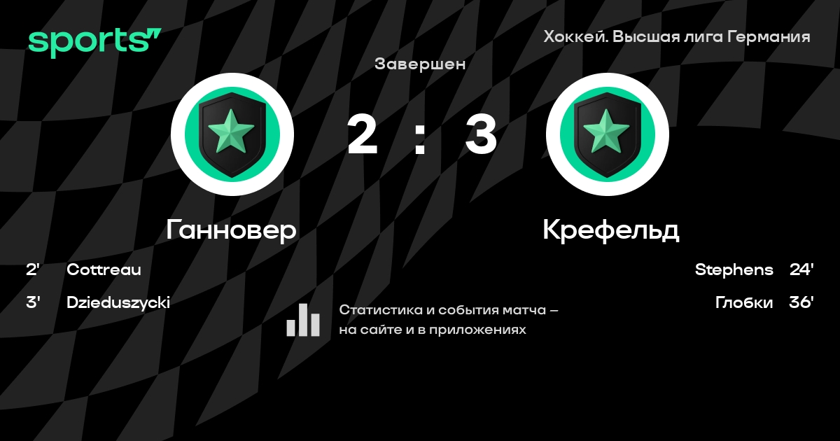 В прошедшем матче в рамках турнира Хоккей. Высшая лига Германия состоялась встреча команд Ганновер - Крефельд со счетом 2 : 3.