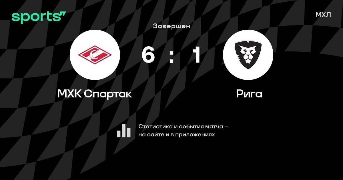 В прошедшем матче в рамках турнира МХЛ состоялась встреча команд МХК Спартак - Рига в городе Москва (Россия) на стадионе ЦСКА-Арена со счетом 6 : 1.