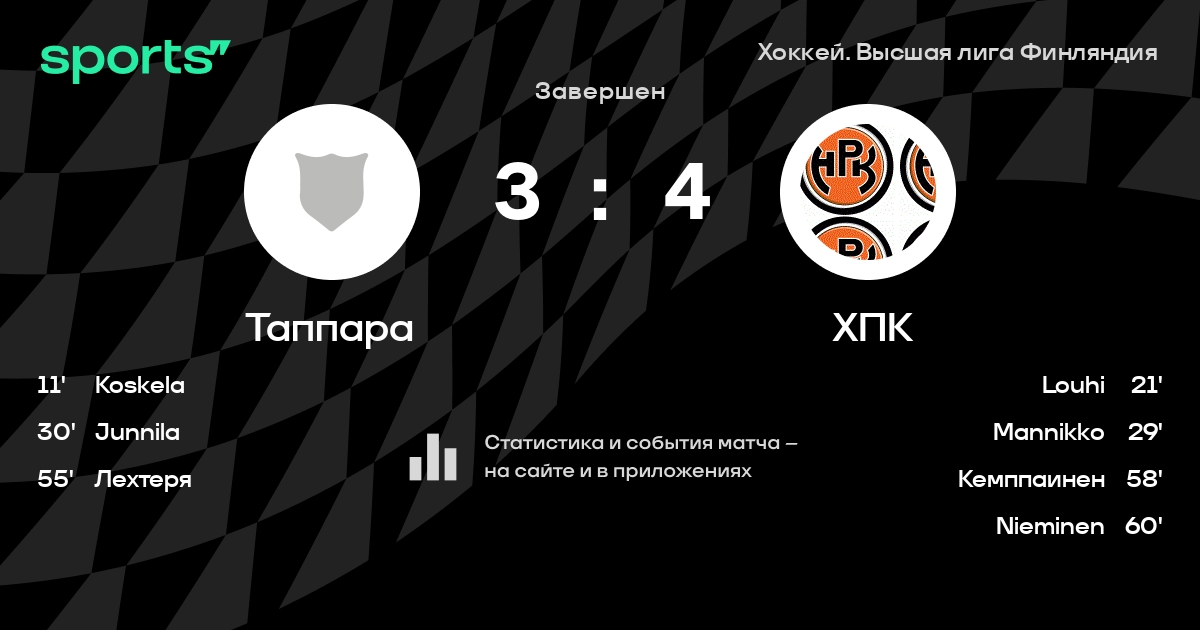 В прошедшем матче в рамках турнира Хоккей. Высшая лига Финляндия состоялась встреча команд Таппара - ХПК со счетом 3 : 4.
