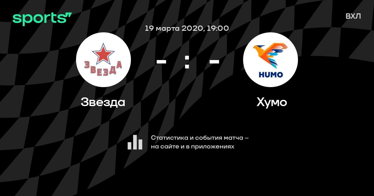 В предстоящем матче в рамках турнира ВХЛ пройдет встреча команд Звезда - Хумо . Начало встречи запланировано на 19:00 19 марта, 2020 2020.