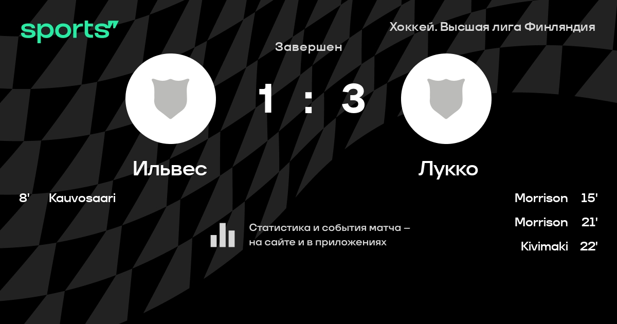 В прошедшем матче в рамках турнира Хоккей. Высшая лига Финляндия состоялась встреча команд Ильвес - Лукко со счетом 1 : 3.