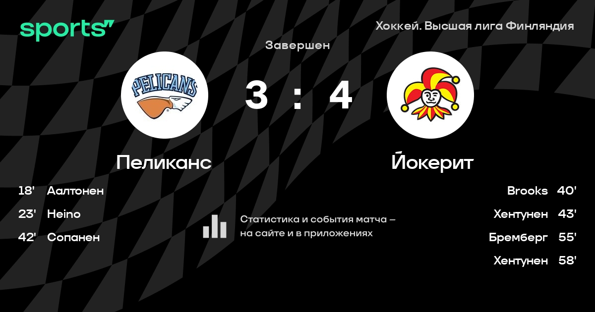 В прошедшем матче в рамках турнира Хоккей. Высшая лига Финляндия состоялась встреча команд Пеликанс - Йокерит со счетом 3 : 4.