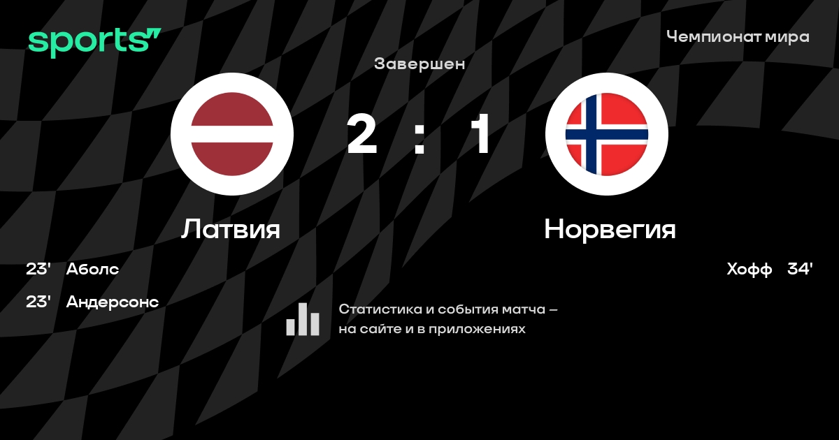 В прошедшем матче в рамках турнира Чемпионат мира Группа B состоялась встреча команд Латвия - Норвегия в городе Рига (Латвия) на стадионе Арена-Рига (вместимость - 12500)