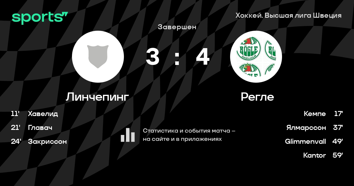 В прошедшем матче в рамках турнира Хоккей. Высшая лига Швеция состоялась встреча команд Линчепинг - Регле со счетом 3 : 4.