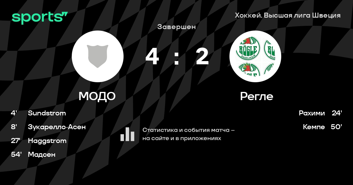 В прошедшем матче в рамках турнира Хоккей. Высшая лига Швеция состоялась встреча команд МОДО - Регле со счетом 4 : 2.