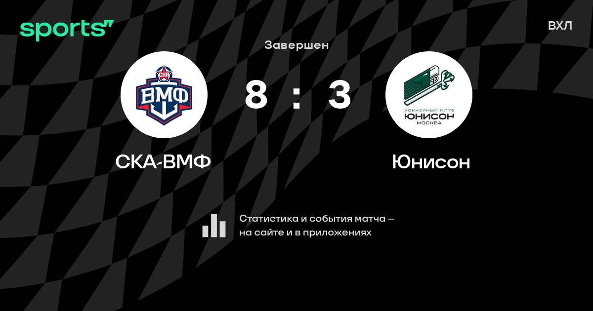 В прошедшем матче в рамках турнира ВХЛ состоялась встреча команд СКА-ВМФ - Юнисон в городе на стадионе Hockey City со счетом 8 : 3.