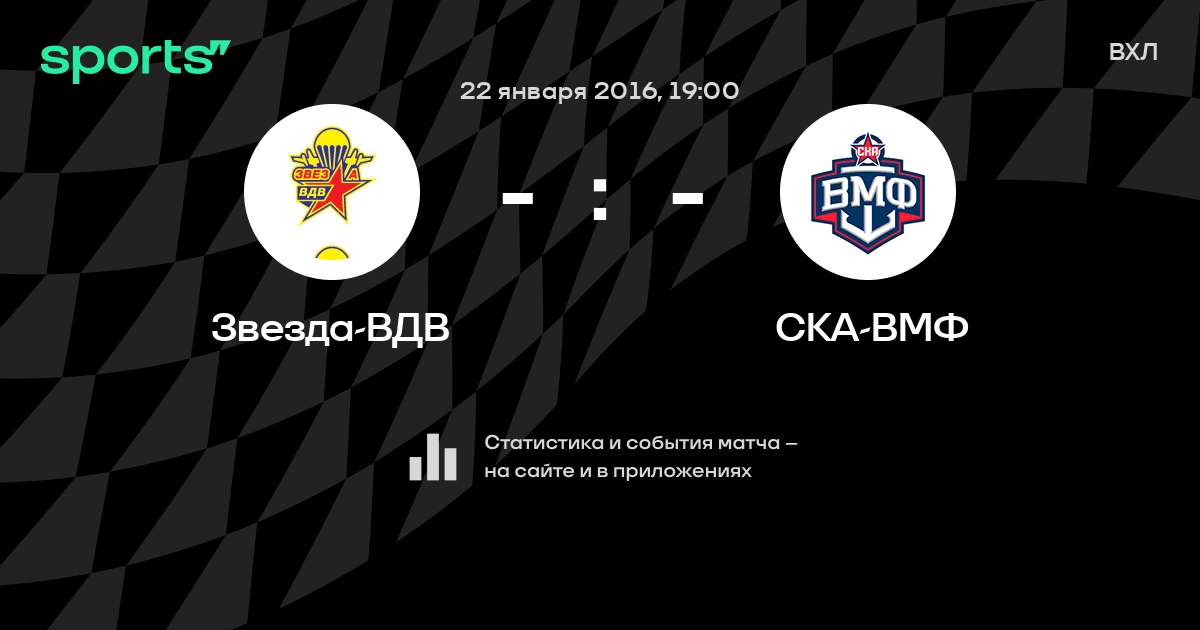 В предстоящем матче в рамках турнира ВХЛ пройдет встреча команд Звезда-ВДВ - СКА-ВМФ . Начало встречи запланировано на 19:00 22 января, 2016 2016.
