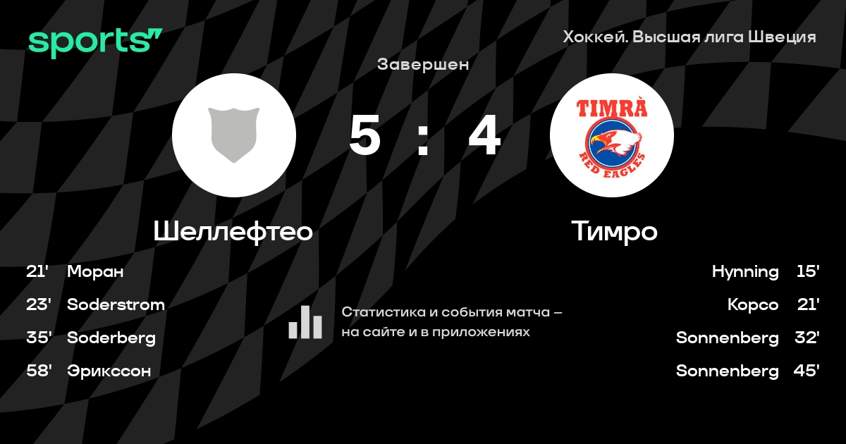 В прошедшем матче в рамках турнира Хоккей. Высшая лига Швеция состоялась встреча команд Шеллефтео - Тимро со счетом 5 : 4.
