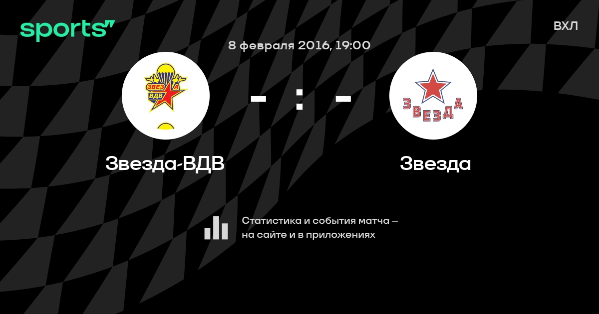 В предстоящем матче в рамках турнира ВХЛ пройдет встреча команд Звезда-ВДВ - Звезда . Начало встречи запланировано на 19:00 8 февраля, 2016 2016.
