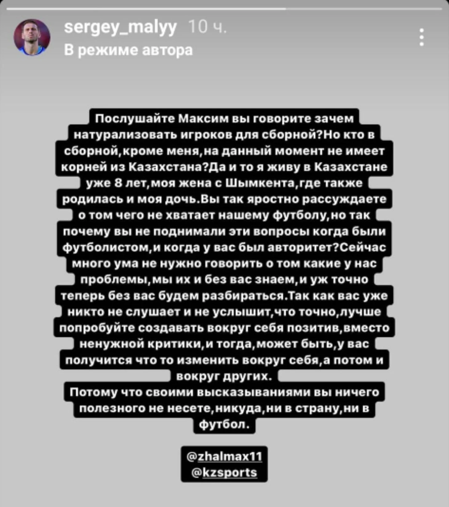 «Послушайте, Максим. Вы говорите: «Зачем натурализовывать игроков для сборной?». Но кто в команде, кроме меня, на данный момент не имеет казахстанских корней?