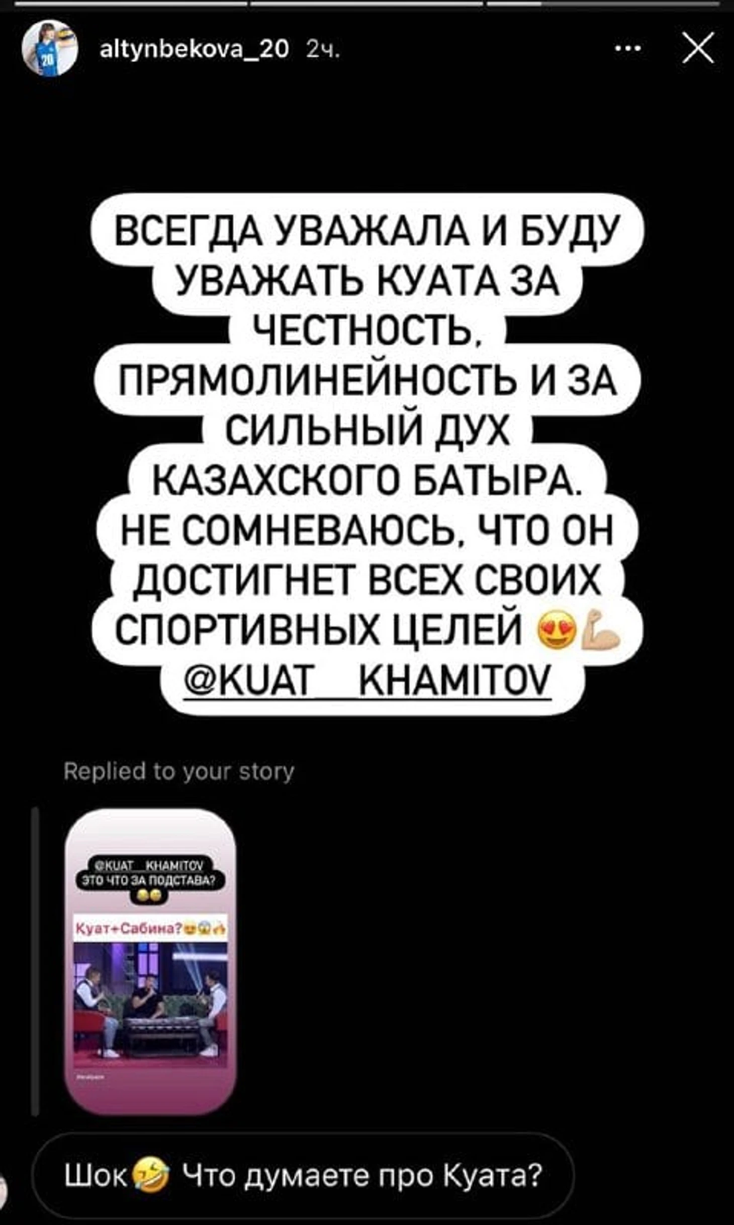 «Всегда уважала и буду уважать Куата за честность, прямолинейность и за сильный дух казахского батыра. Не сомневаюсь, что он достигнет всех своих спортивных целей», – написала Сабина в сторис.