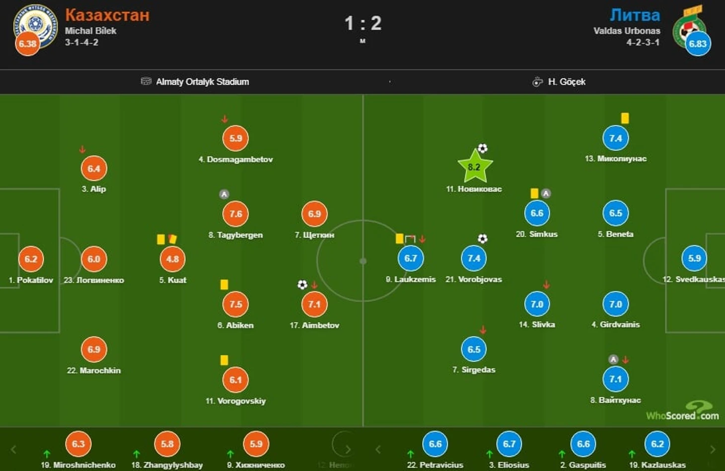 Портал WhoScored опубликовал оценки за матч заключительного тура Лиги наций между Казахстаном и Литвой (1:2).
