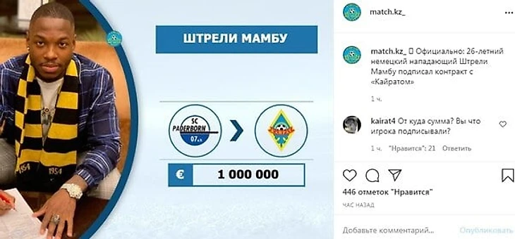 Руководитель «Кайрата» Кайрат Боранбаев отреагировал на публикацию о стоимости трансфера Стрели Мамба. По версии match.kz переход нападающего из «Падерборна» обошелся алматинскому клубу в 1 миллион евро. После чего в комментариях Боранбаев написал: «Откуда такая сумма? Вы игрока подписывали?».