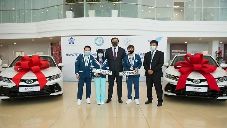Игорь Сон и Зульфия Чиншанло получили ключи от автомобилей Toyota Camry 75, а личные тренеры были поощрены денежным вознаграждением от президента федерации тяжелой атлетики Казахстана Жаната Тусупбекова.