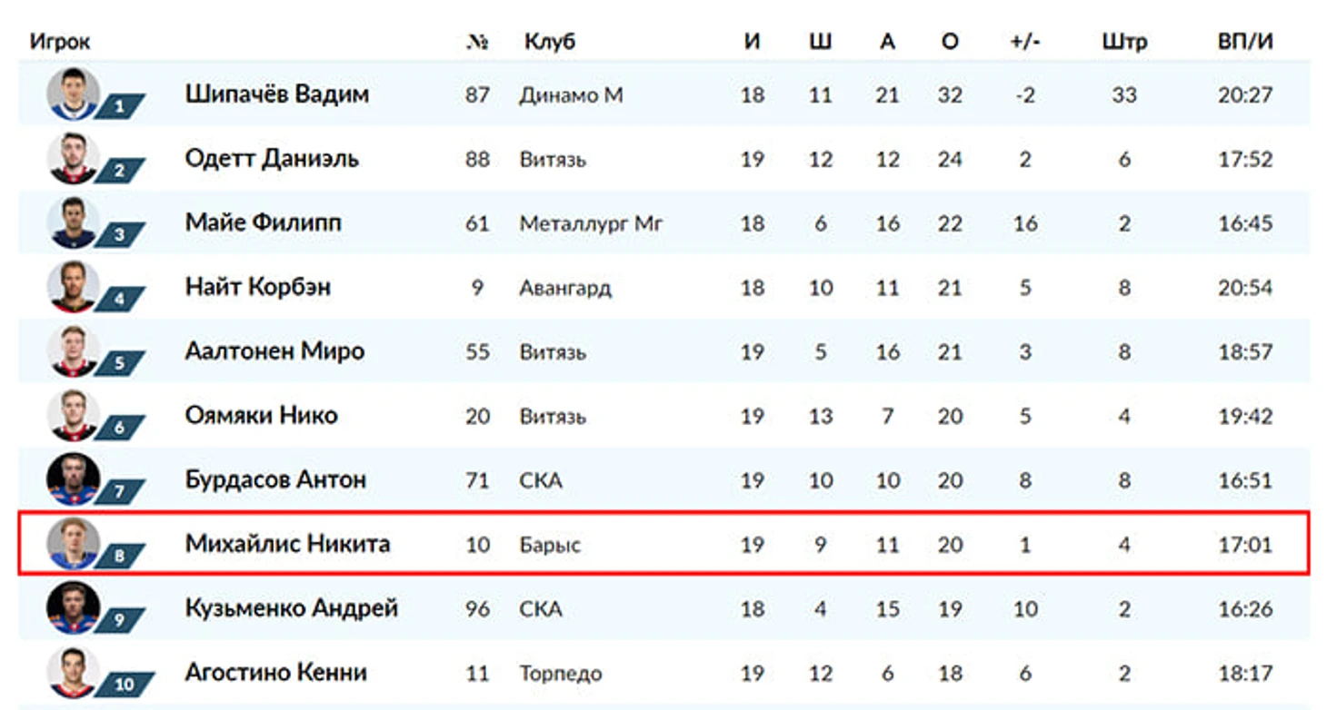 Форвард казахстанского «Барыса» Никита Михайлис поднялся на восьмое место в списке лучших бомбардиров КХЛ.