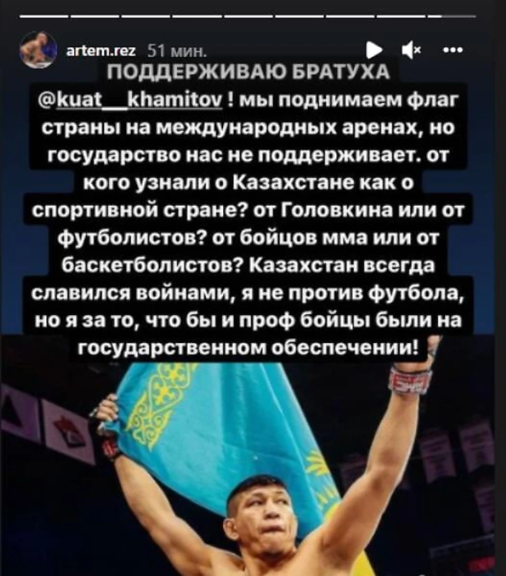«Поддерживаю, брат! Мы поднимаем флаг страны на международных аренах, но государство нас не поддерживает. От кого узнали о Казахстане как о спортивной стране? От Головкина или от футболистов? От бойцов ММА или от баскетболистов? Казахстан всегда славился войнами. Я не против футбола, но я за то, чтобы и профессиональные бойцы были на государственном обеспечении», – написал Резников на своем инстаграм.