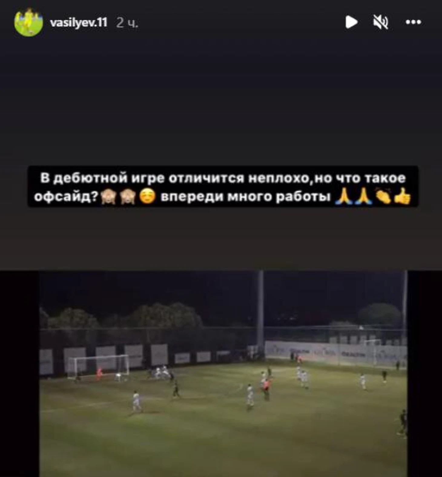 Васильев вышел на замену во втором тайме, хотя в протоколе матча отметился как «игрок на просмотре» — единственный в составе «Тобола». После игры футболист выдал сам себя в Instagram, прокомментировав свой отмененный гол: «В дебютной игре отличиться неплохо, но что такое офсайд? Впереди много работы».