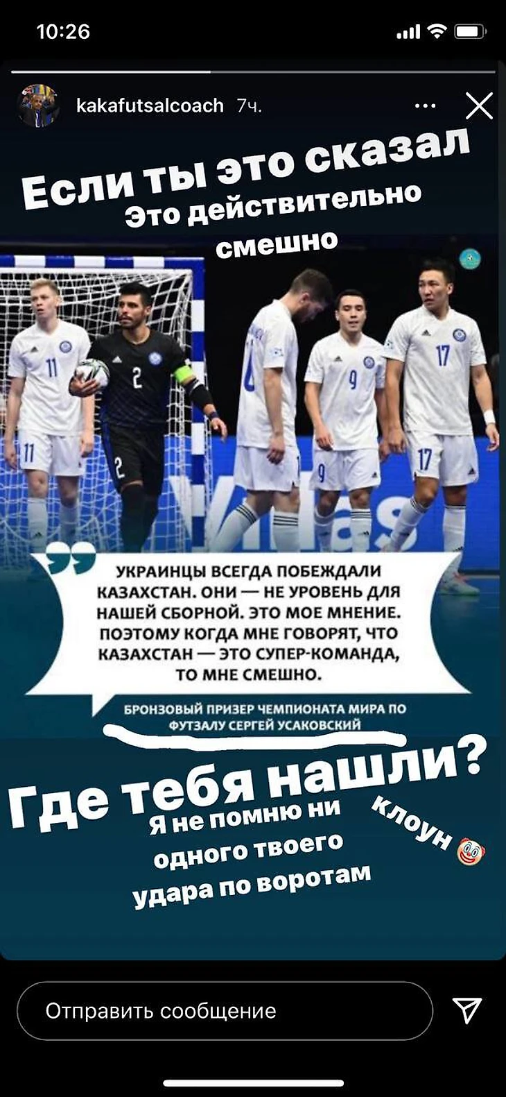 Главный тренер сборной Казахстана по футзалу Кака экс-игроку сборной Украины Усаковскому: «Я не помню ни одного твоего удара по воротам, клоун»