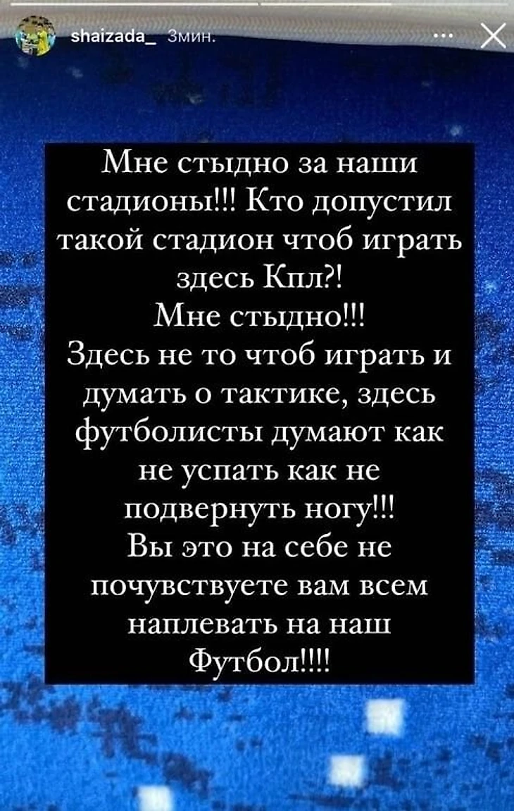 Вратарь «Ордабасы» Бекхан Шайзада раскритиковал в своем инстаграм стадион в Таразе. Сегодня шымкентцы минимально уступили «Таразу» в гостях (0:1).