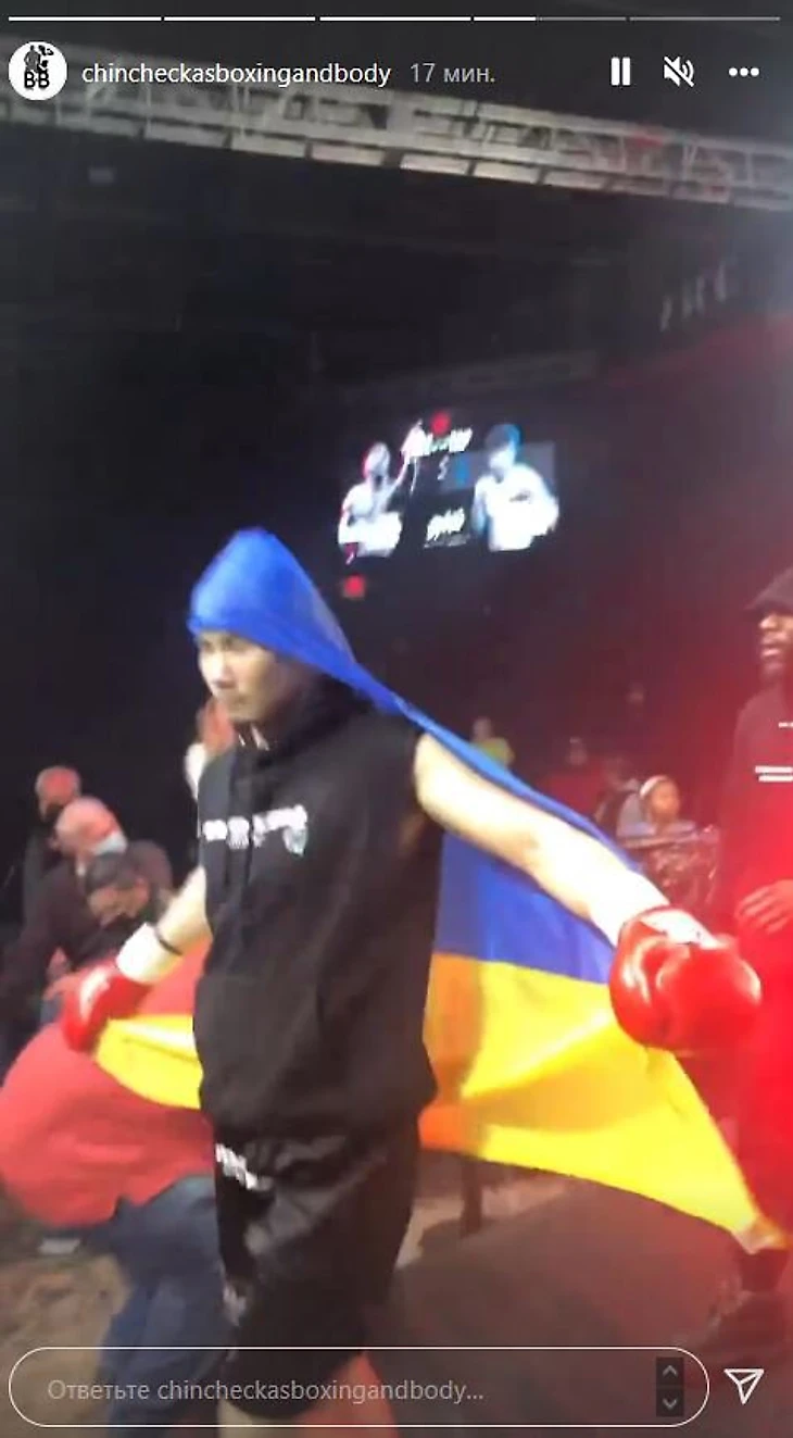 На ринг Раимкулов вышел под флагом Украины, выразив солидарность с украинским народом.
