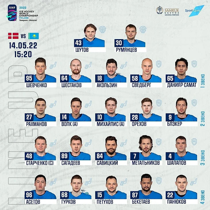 Федерация Хоккея Казахстана опубликовала стартовый состав сборной Казахстана на матч против Дании в группе А на ЧМ по хоккею.