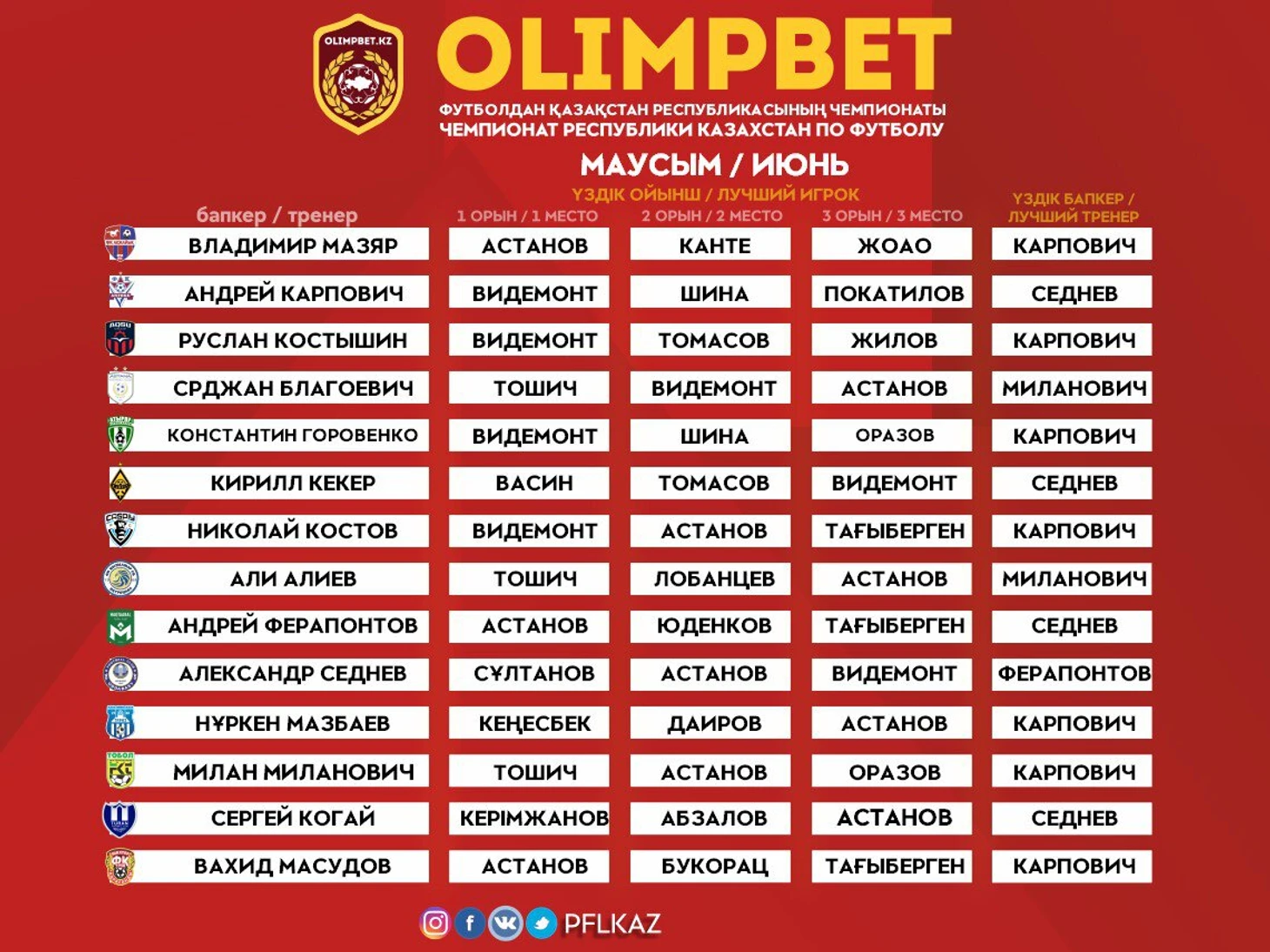 Лучшим тренером июня стал Андрей Карпович из «Актобе».