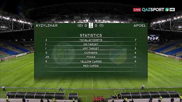 «Кызыл-Жар» сделал 2 удара по воротам (1 в створ) и 25 фолов в матче против АПОЭЛ.