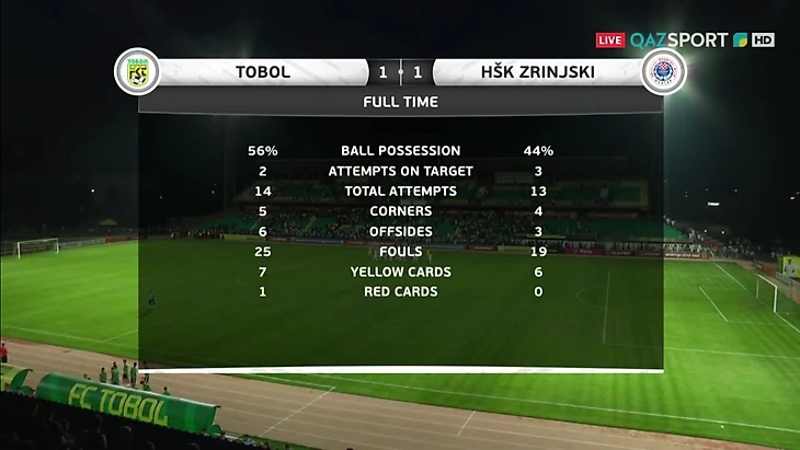 «Тобол» в мачте против «Зриньски»: 14 ударов, 1 забитый и пропущенный гол, 1 удаление