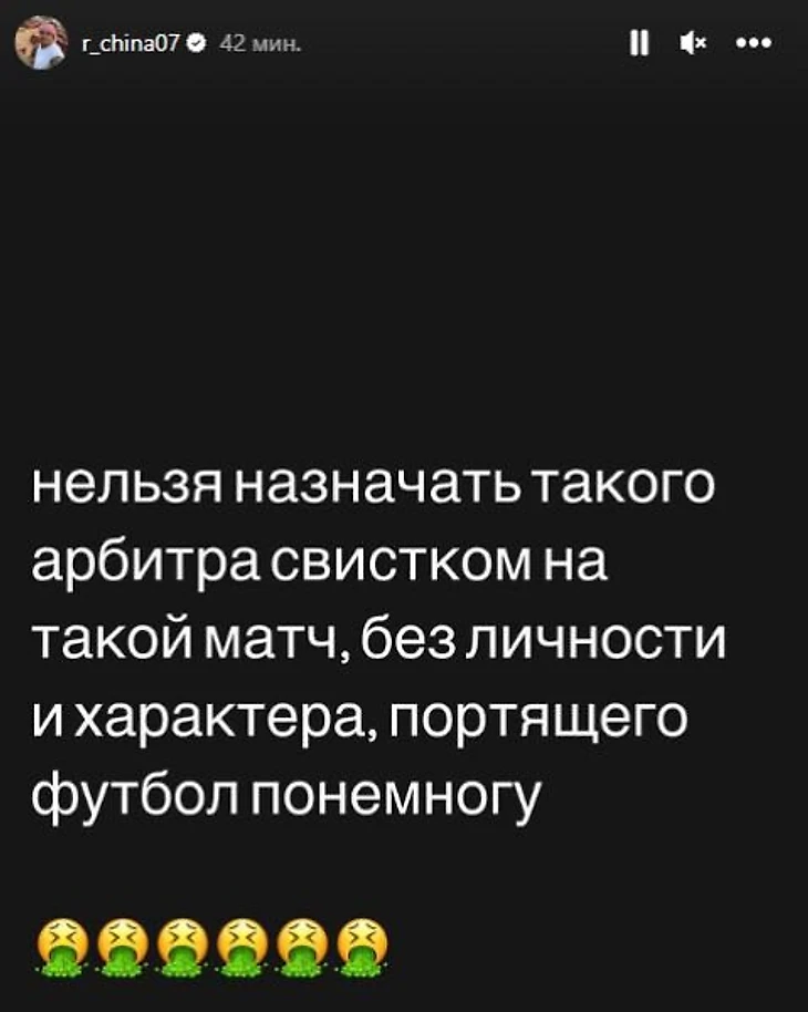 На своей странице в социальной сети в разделе сторис бразильский форвард написал следующее о проигранной встрече: «Нельзя назначать такого арбитра на такой матч без личности и характера, портящего игру понемногу».