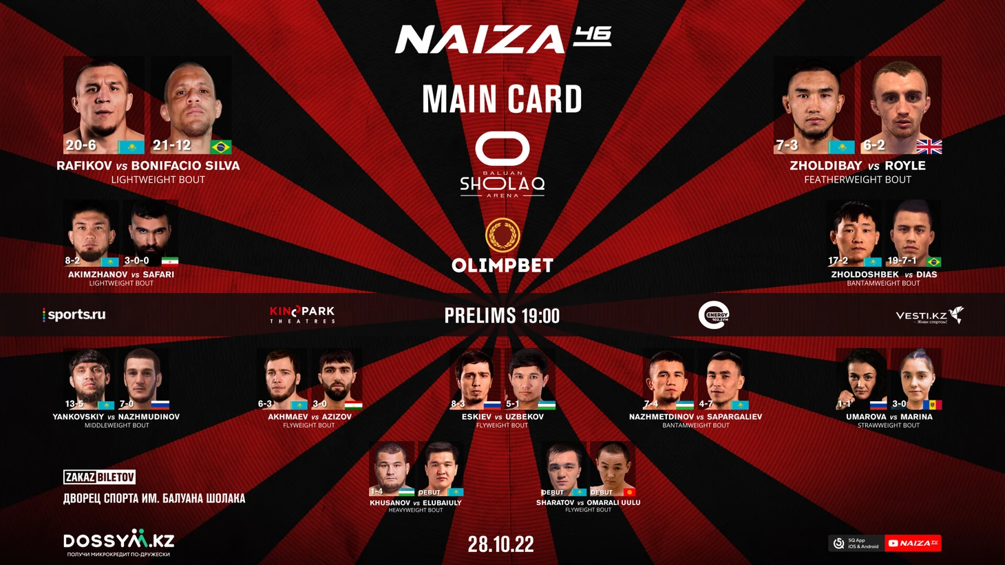 Интрига вечера – бой бывшего чемпиона Naiza в легком весе Фаниля Рафикова и опытного бразильца Луиса Бонифация Сильвы. Лучший букмекер страны предлагает следующие коэффициенты на этот поединок: П1 – 1.21; П2 – 3.9. Напомним, ранее заокеанский спортсмен победил другого казахстанца Армана Оспанова в лиге АСА.