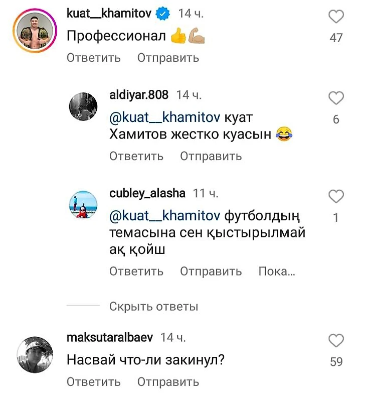 Хамитов отметился в комментариях под видео с данным поступком футболиста в Instagram-аккаунте казахстанского спортивного портала. «Профессионал», — написал «Найман», добавив к записи пару эмодзи.