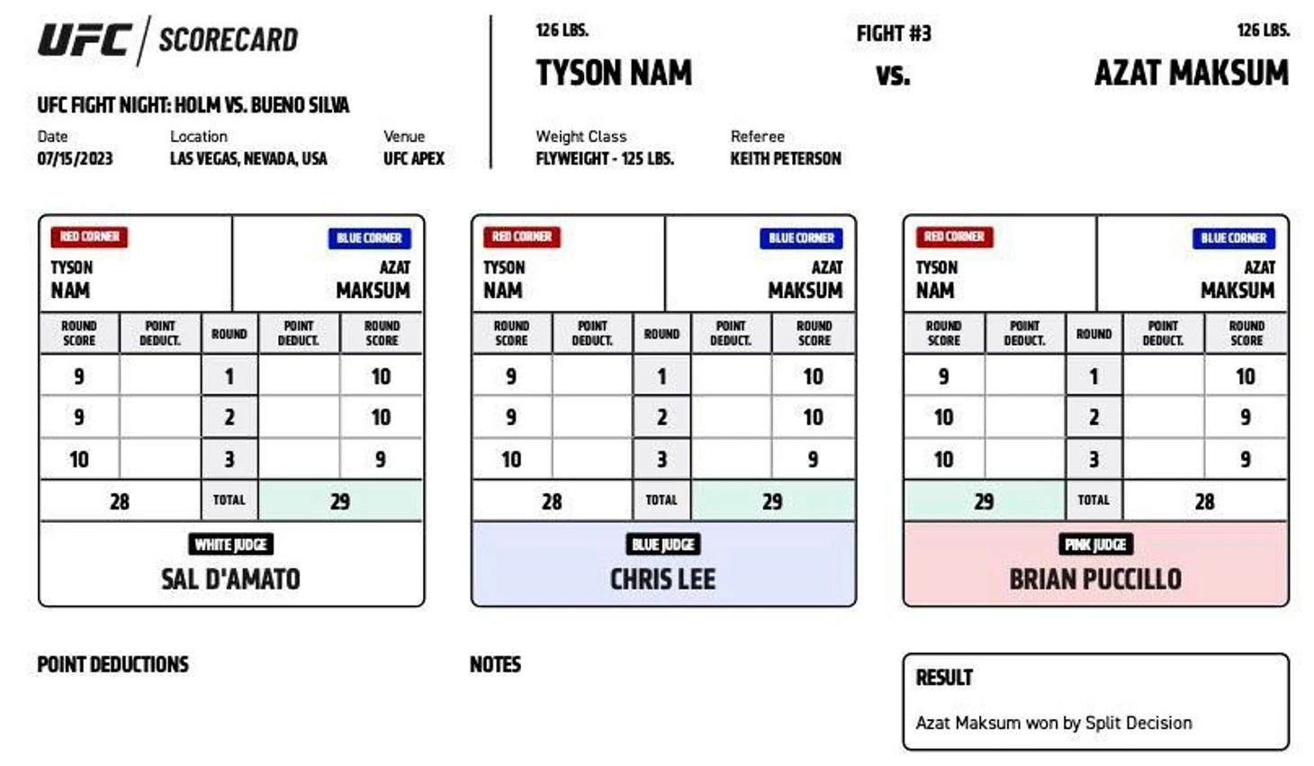 Опубликованы судейские записки дебютного боя казахстанца Азата Максума в UFC против американца Тайсона
