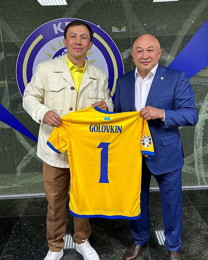 Экс-чемпион мира Геннадий Головкин получил символический подарок от главы казахстанской федерации футбола Адлета Барменкулова после матча сборной Казахстана с Северной Ирландией (1:0).