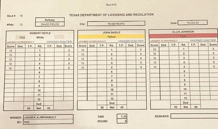 Опубликованы судейские записки объединительного поединка за титулы WBO и IBF между казахстанцем Жанибеком Алимханулы и немцем Винченцо Гуальтьери.