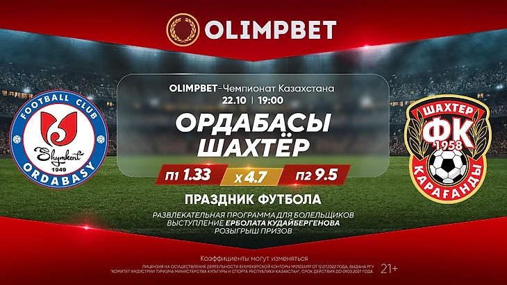 А с 17:00 отличное настроение болельщиков на стадионе будет поддерживать букмекер №1 в Казахстане Olimpbet. Он подготовил насыщенную развлекательную программу с розыгрышем смартфона и выступлением Ерболата Кудайбергенова. Не пропустите матч, который может стать историческим для футбольного Шымкента!