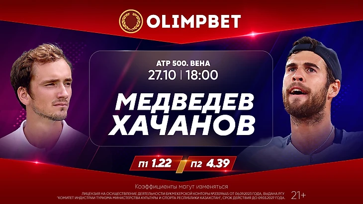 Эксперты Olimpbet уверены, что Медведев выиграет еще одно противостояние с Хачановым и оформит выход в полуфинал – П1 –  1.22, П2 – 4.39. Коэффициент на то, что он отдаст сопернику один сет, равен 3.5.