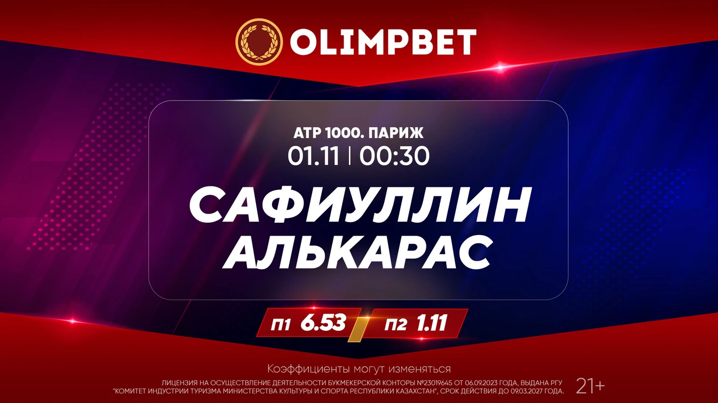 Аналитики Olimpbet отдают в этом матче однозначное предпочтение Алькарасу – П1 – 6.53, П2 – 1.11. Самый высокий коэффициент предлагается на сенсационную победу россиянина в двух сетах – 9.5.