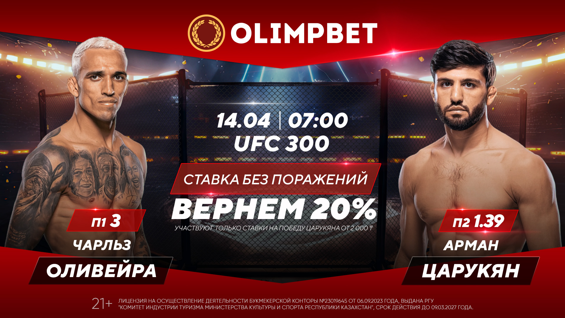 Аналитики крупнейшего букмекера Казахстана считают Царукяна однозначным фаворитом: коэффициент на его победу – 1.43, на победу Оливейры – 2.83. Кроме того, на этот бой действует специальное предложение от Olimpbet: если ставка (от 2000 тенге) на Армана не сыграет, на счет вернется 20% кешбэком.