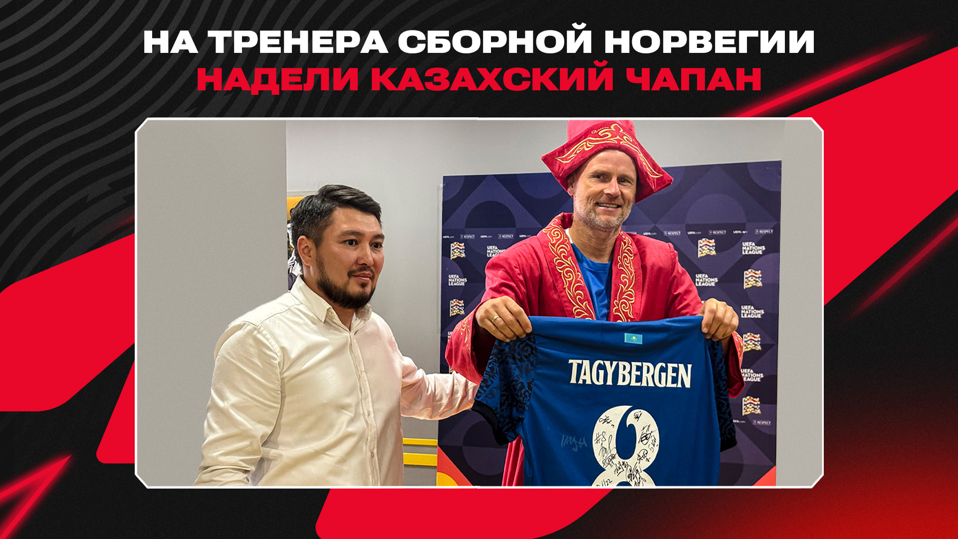 Директор по развитию Olimpbet, Абзал Калиев, надел традиционный казахский чапан на главного тренера сборной Норвегии Столе Сольбаккена.