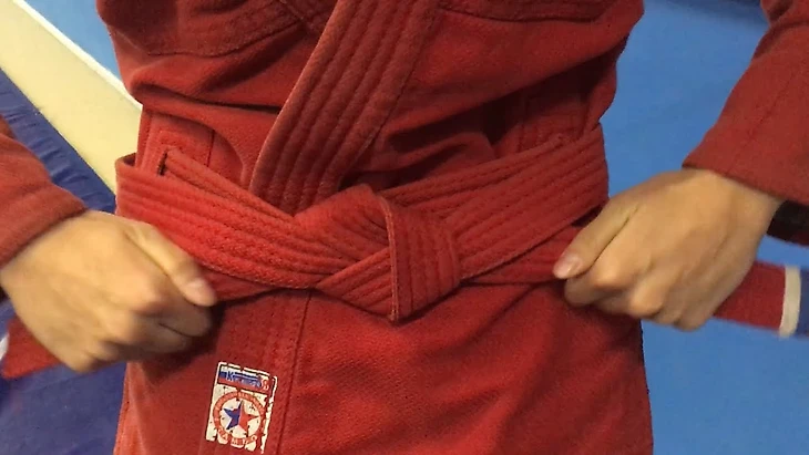 В самбо важно подбирать и завязать пояс так, чтобы он не стеснял движений во время схватки, не передавливал талию и не мешал дыханию. Спортсмен должен чувствовать себя комфортно. Не следует допускать перекрутки пояса. Перед тем как его завязывать, нужно правильно надеть куртку. Правая ее сторона ложиться поверх левой так, чтобы прорези для пояса были на одной линии. Следом нужно завязать пояс.