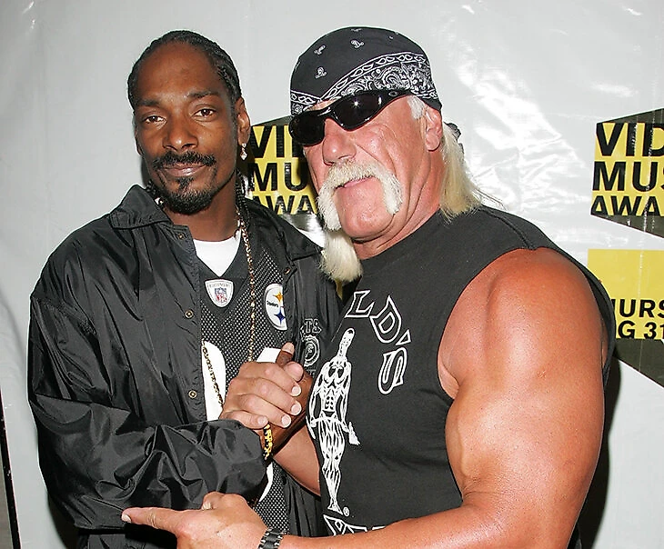 С перерывами он выступал аж до 2015-го. Тогда вместе с репером Снуп Доггом вышел против Кертиса Акселя, который украл фирменный прием Хогана.