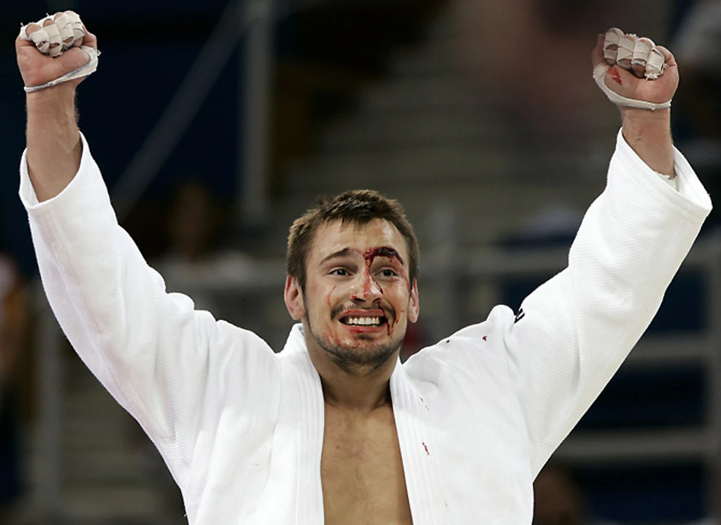 Единственный выход для Димы – провести результативную атаку. И он сумел – сделал амплитудный, необычный для дзюдо прием, напоминающий карелинский «обратный пояс». Преимущество, полученное благодаря этому броску, пришлось удерживать еще некоторое время. Когда прозвучал сигнал об окончании схватки, Носов, умудрившийся еще и рассечь в борьбе бровь, победно вскинул руки. Вместе с ним это сделали и сотни зрителей. С татами Дима сошел победителем.