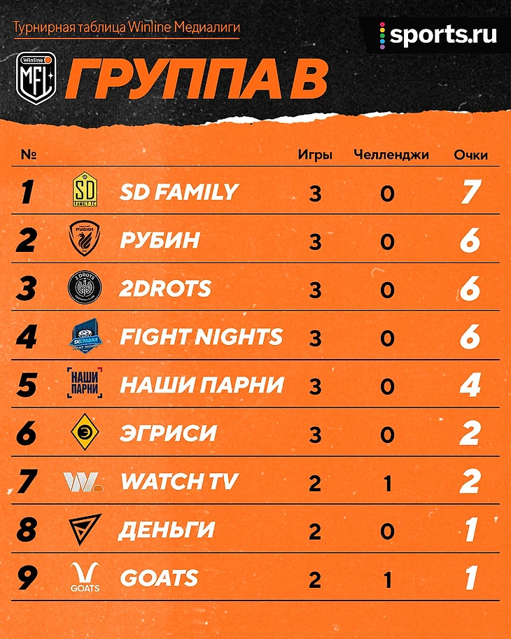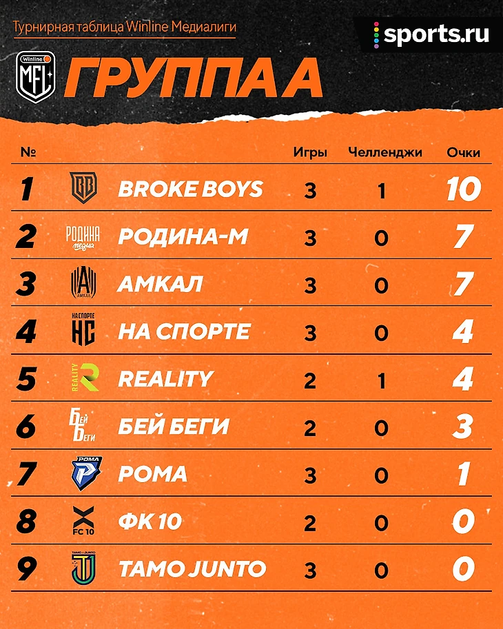 Турнирная таблица Медиалиги. «Броуки» лидируют в группе A без потерь, SD Family – первые в группе B