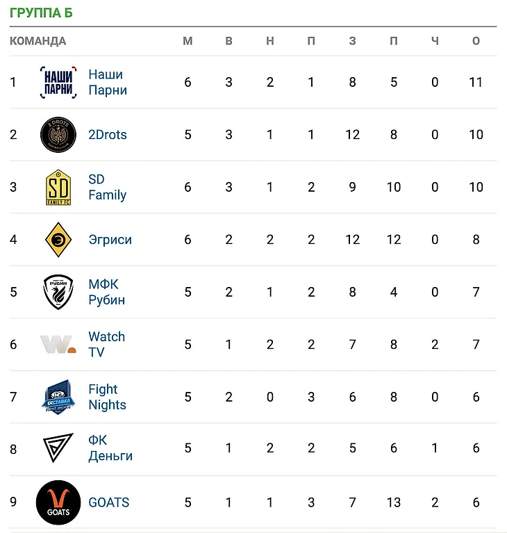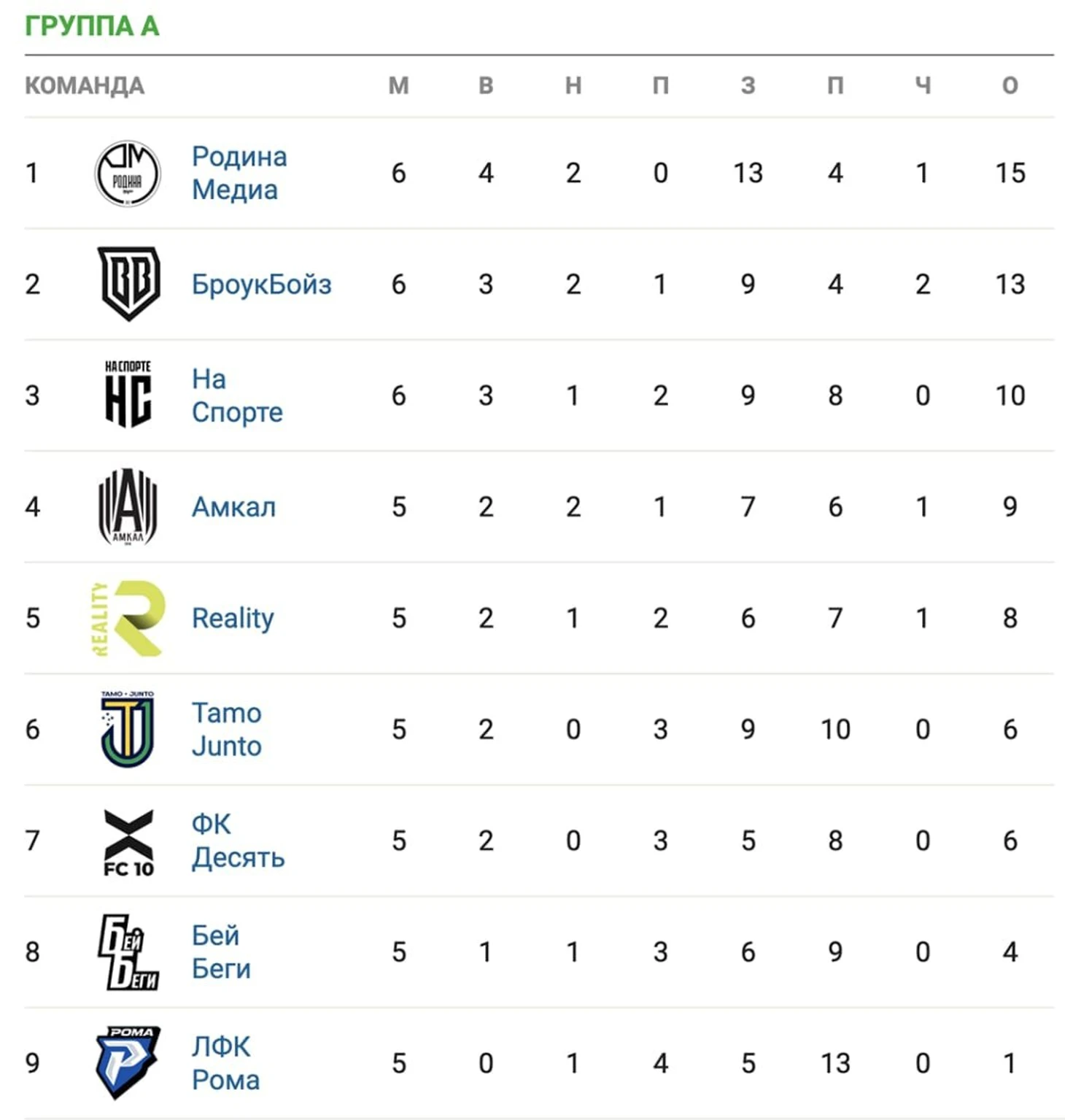 В группе А на первом месте остается «Родина Медиа», обыгравшая «Броуков» (2:1). У нее 15 очков.